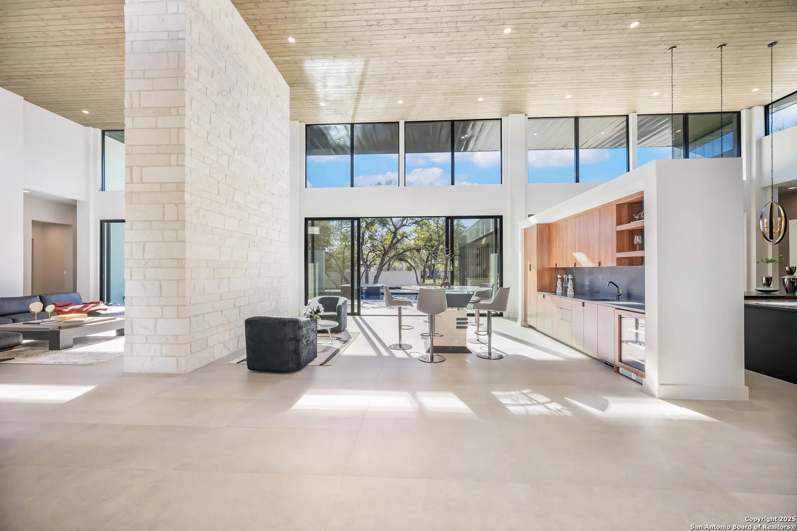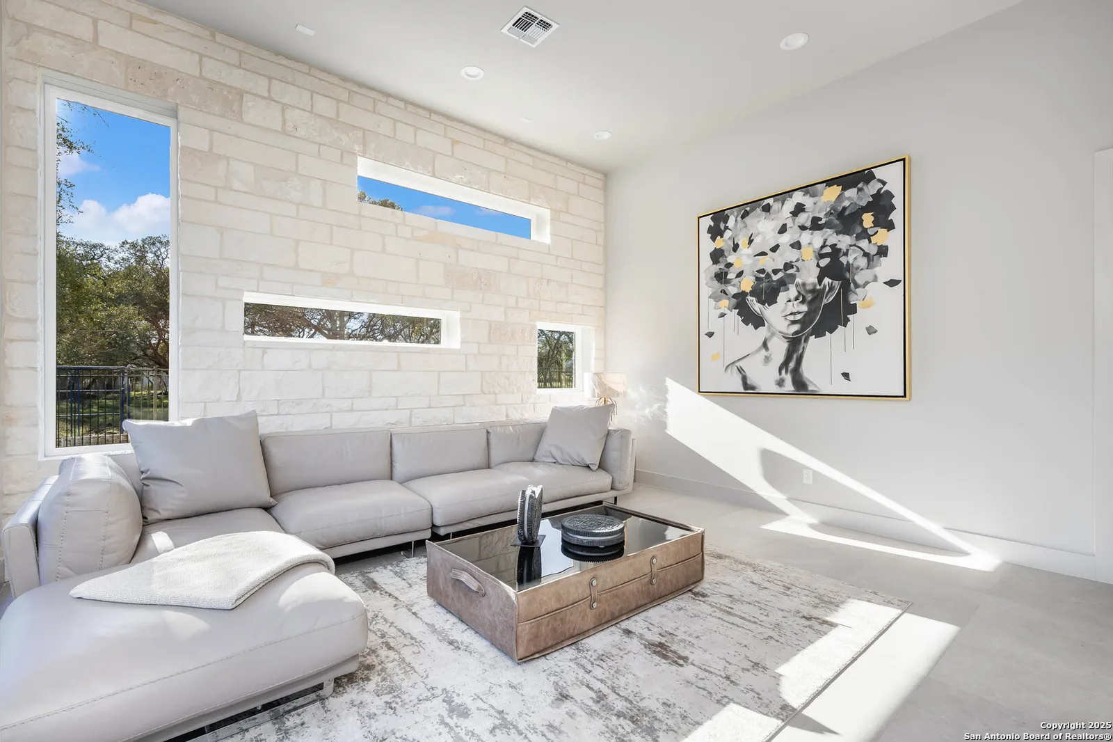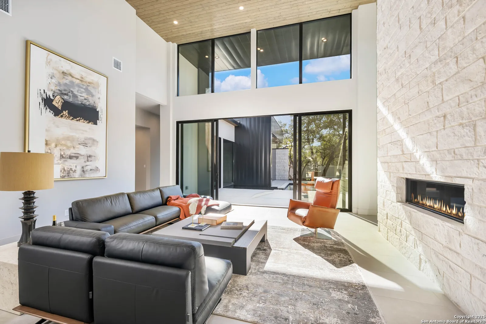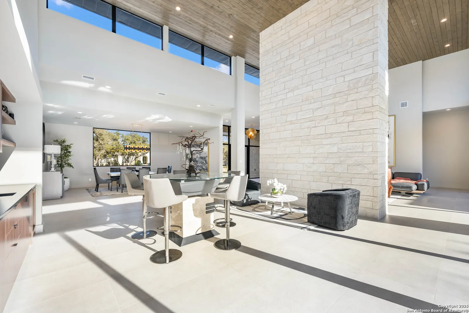 Nestled on a pristine 1-acre lot in the prestigious Huntington in Shavano Park community, this breathtaking one-story luxury home offers a perfect blend of contemporary elegance and unparalleled comfort. Spanning an impressive 7,208 square feet, this residence is thoughtfully designed to offer both opulent living spaces and modern amenities. Boasting six generously sized bedrooms and six and a half beautifully appointed bathrooms, this home is the epitome of sophistication. The open-concept design features soaring 20-foot ceilings, filling each room with an abundance of natural light. Expansive windows frame views of the lush oak trees that dot the landscape, creating a serene and picturesque setting.