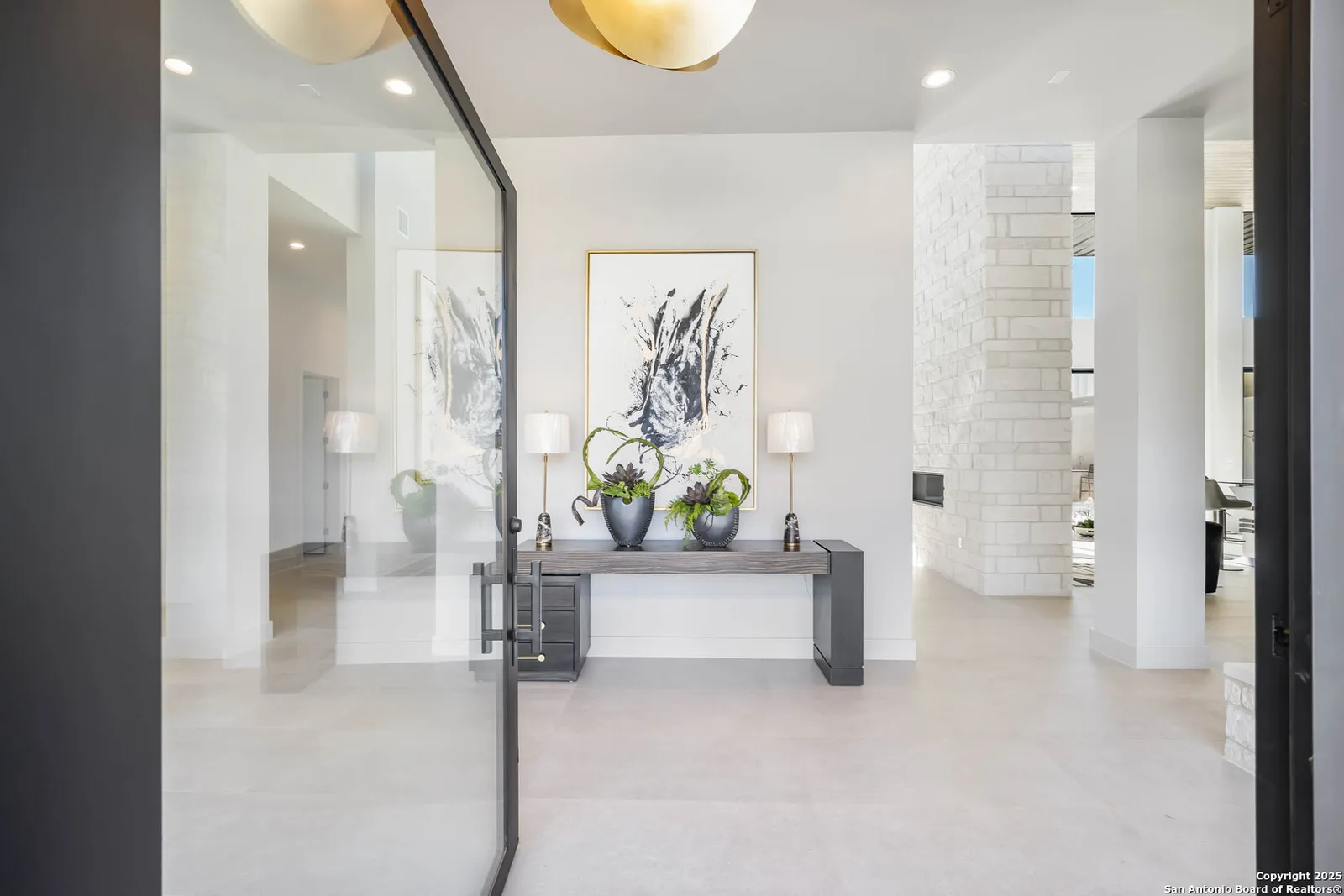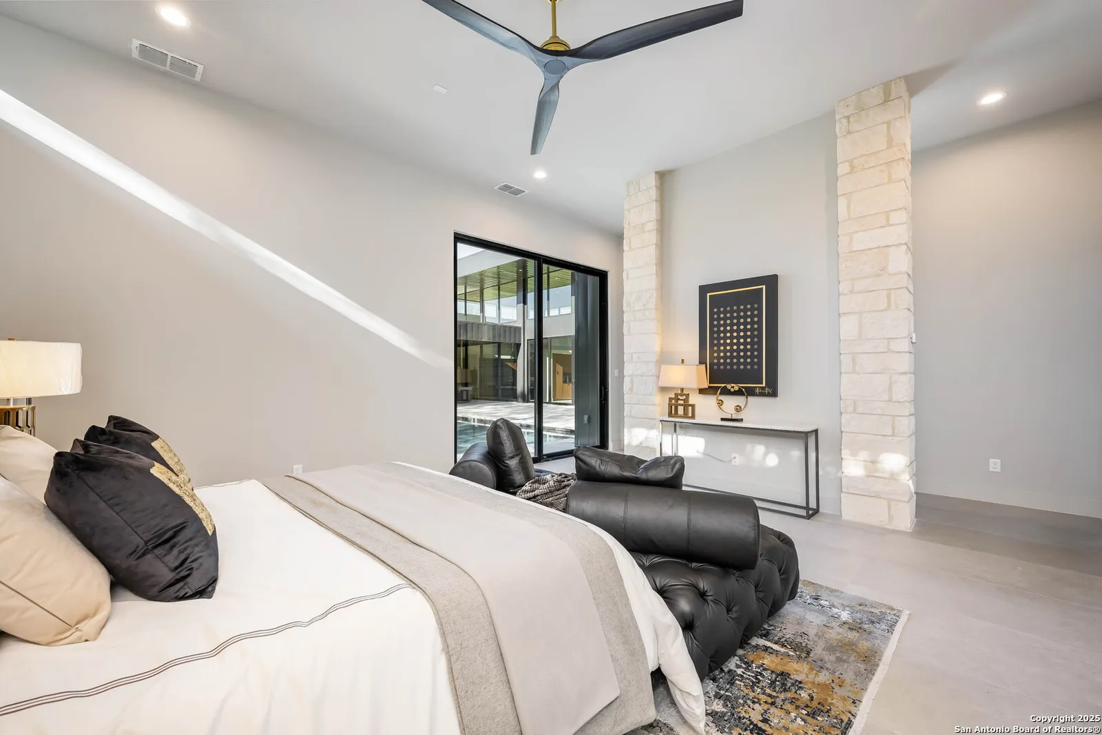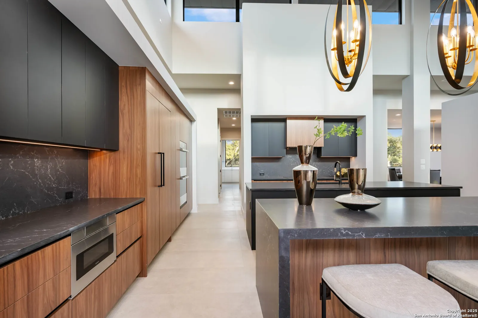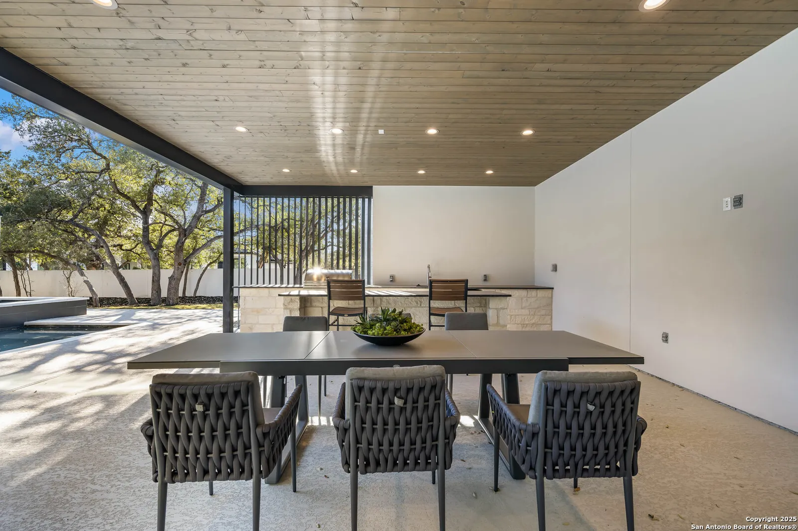 Nestled on a pristine 1-acre lot in the prestigious Huntington in Shavano Park community, this breathtaking one-story luxury home offers a perfect blend of contemporary elegance and unparalleled comfort. Spanning an impressive 7,208 square feet, this residence is thoughtfully designed to offer both opulent living spaces and modern amenities. Boasting six generously sized bedrooms and six and a half beautifully appointed bathrooms, this home is the epitome of sophistication. The open-concept design features soaring 20-foot ceilings, filling each room with an abundance of natural light. Expansive windows frame views of the lush oak trees that dot the landscape, creating a serene and picturesque setting.