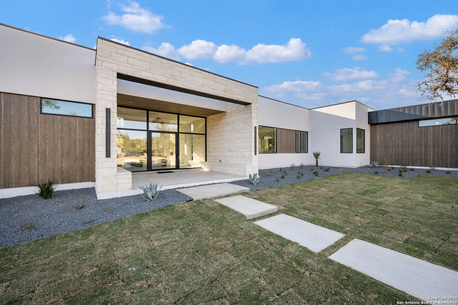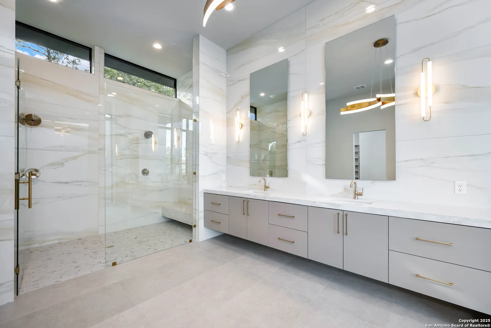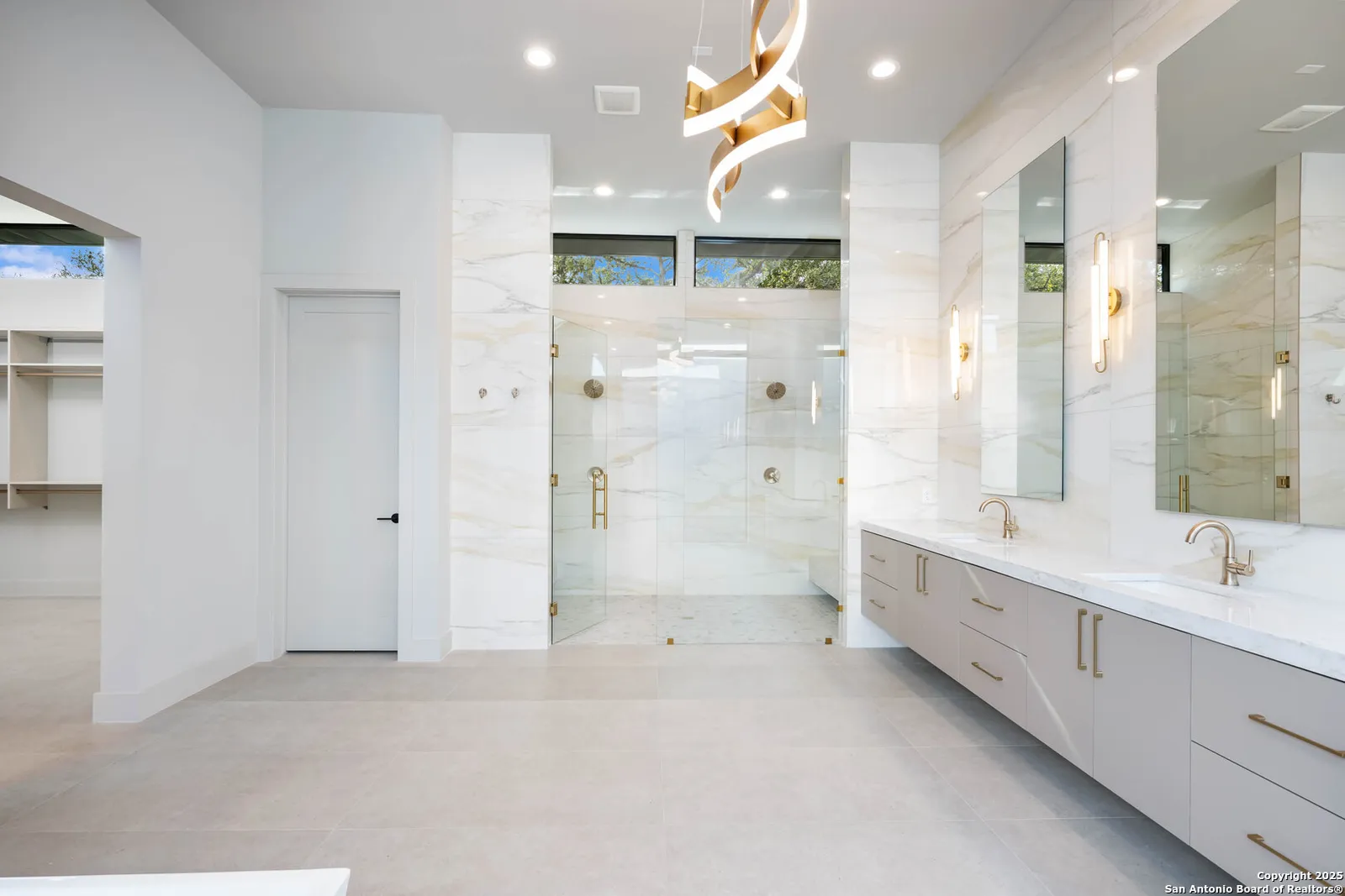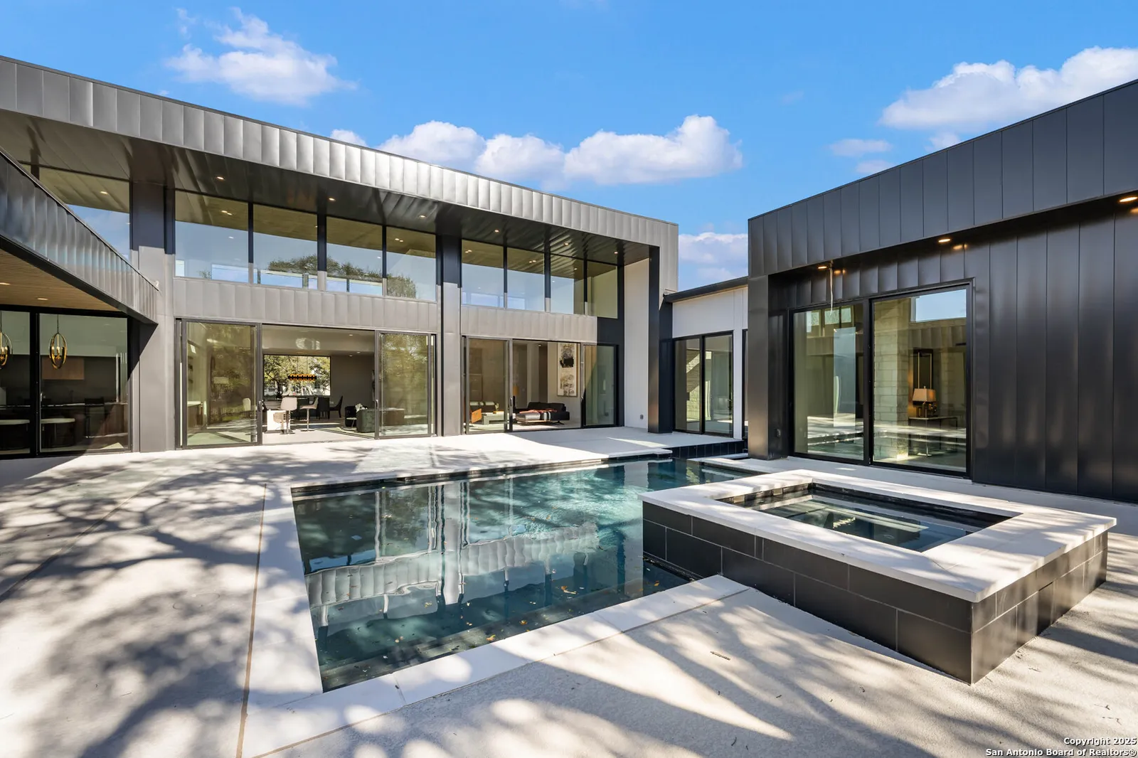 Nestled on a pristine 1-acre lot in the prestigious Huntington in Shavano Park community, this breathtaking one-story luxury home offers a perfect blend of contemporary elegance and unparalleled comfort. Spanning an impressive 7,208 square feet, this residence is thoughtfully designed to offer both opulent living spaces and modern amenities. Boasting six generously sized bedrooms and six and a half beautifully appointed bathrooms, this home is the epitome of sophistication. The open-concept design features soaring 20-foot ceilings, filling each room with an abundance of natural light. Expansive windows frame views of the lush oak trees that dot the landscape, creating a serene and picturesque setting.