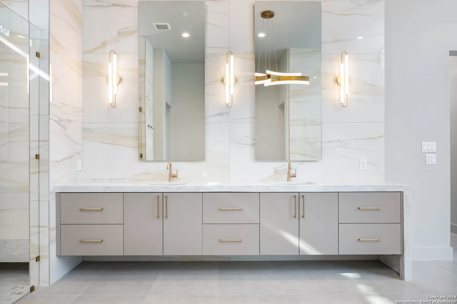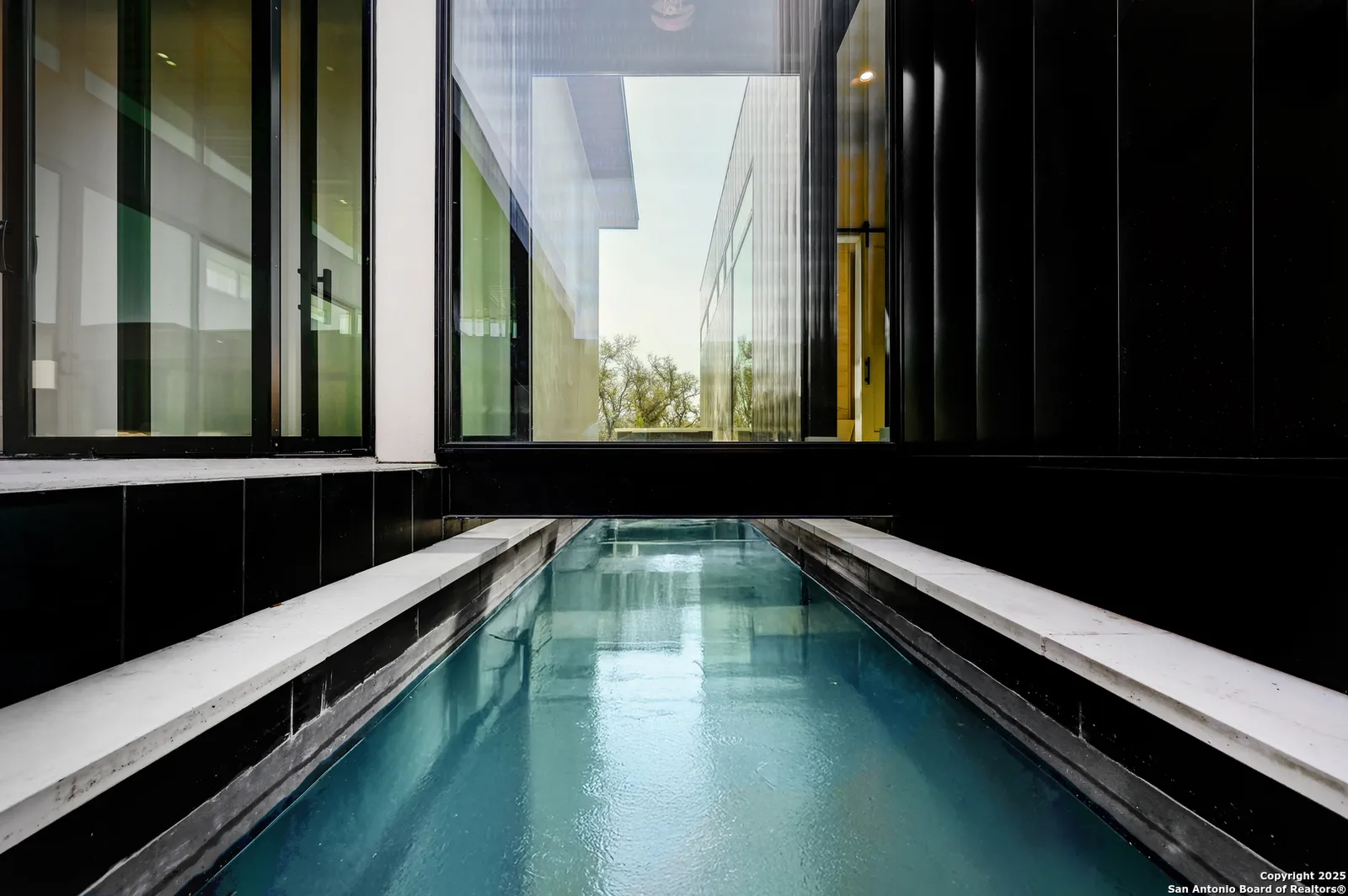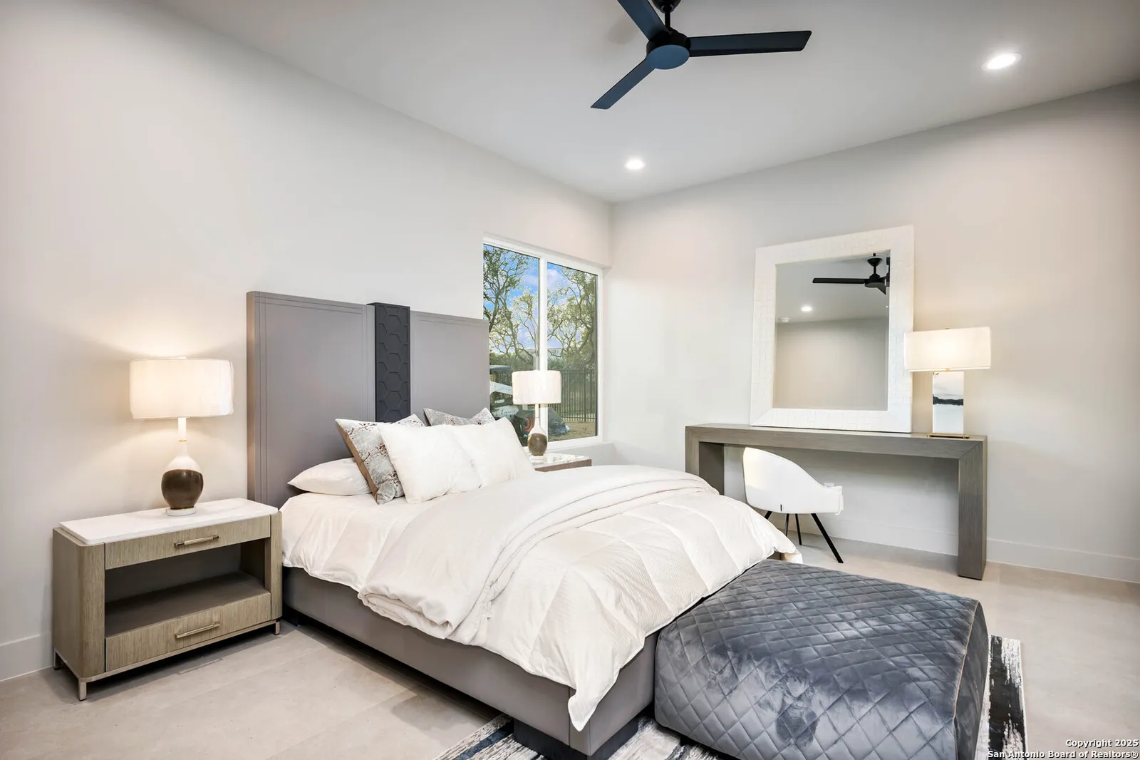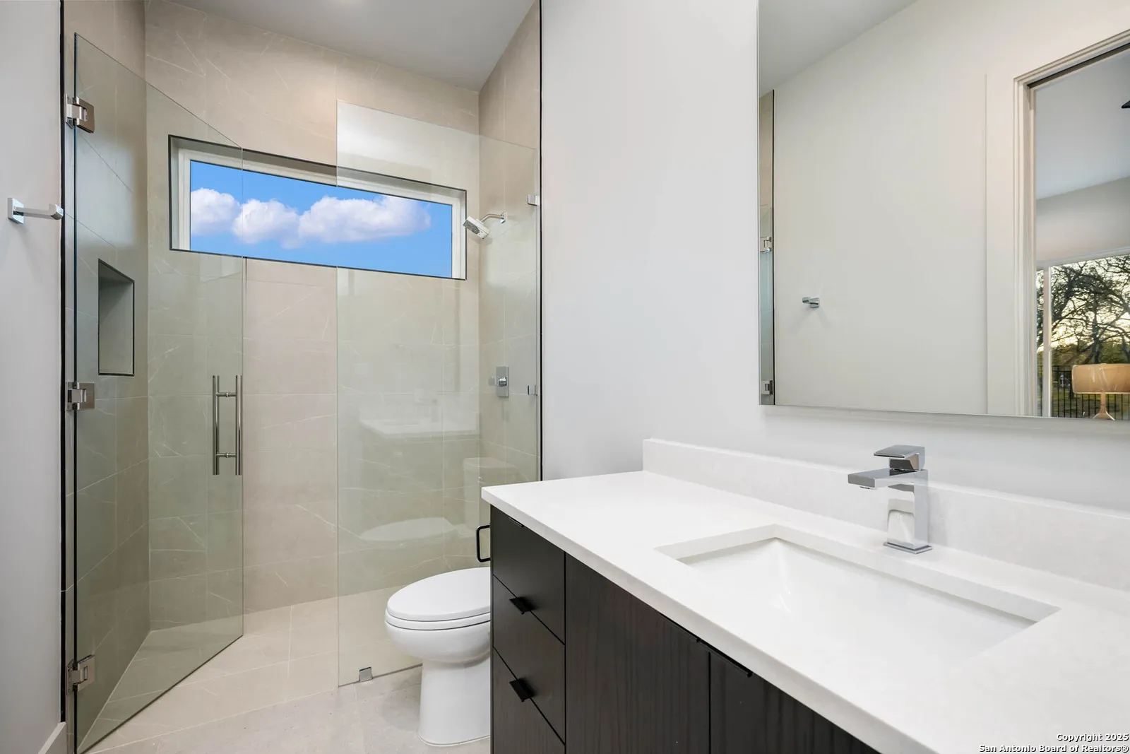 Nestled on a pristine 1-acre lot in the prestigious Huntington in Shavano Park community, this breathtaking one-story luxury home offers a perfect blend of contemporary elegance and unparalleled comfort. Spanning an impressive 7,208 square feet, this residence is thoughtfully designed to offer both opulent living spaces and modern amenities. Boasting six generously sized bedrooms and six and a half beautifully appointed bathrooms, this home is the epitome of sophistication. The open-concept design features soaring 20-foot ceilings, filling each room with an abundance of natural light. Expansive windows frame views of the lush oak trees that dot the landscape, creating a serene and picturesque setting.